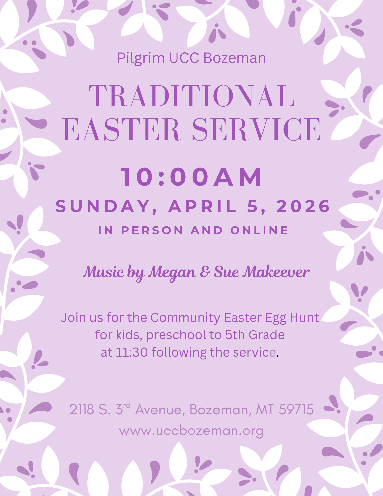 Patti Gehman’s Celebration of Life will be Sat 4/18 at 1:30 pm at Pilgrim in the Sanctuary, followed by a dessert reception in the Boyd Room. It will be livestreamed on Facebook.com/PilgrimChurchBozeman and www.youtube.com/@pilgrimconnect3432 and posted to the Pilgrim website, www. uccbozeman.org, afterwards.