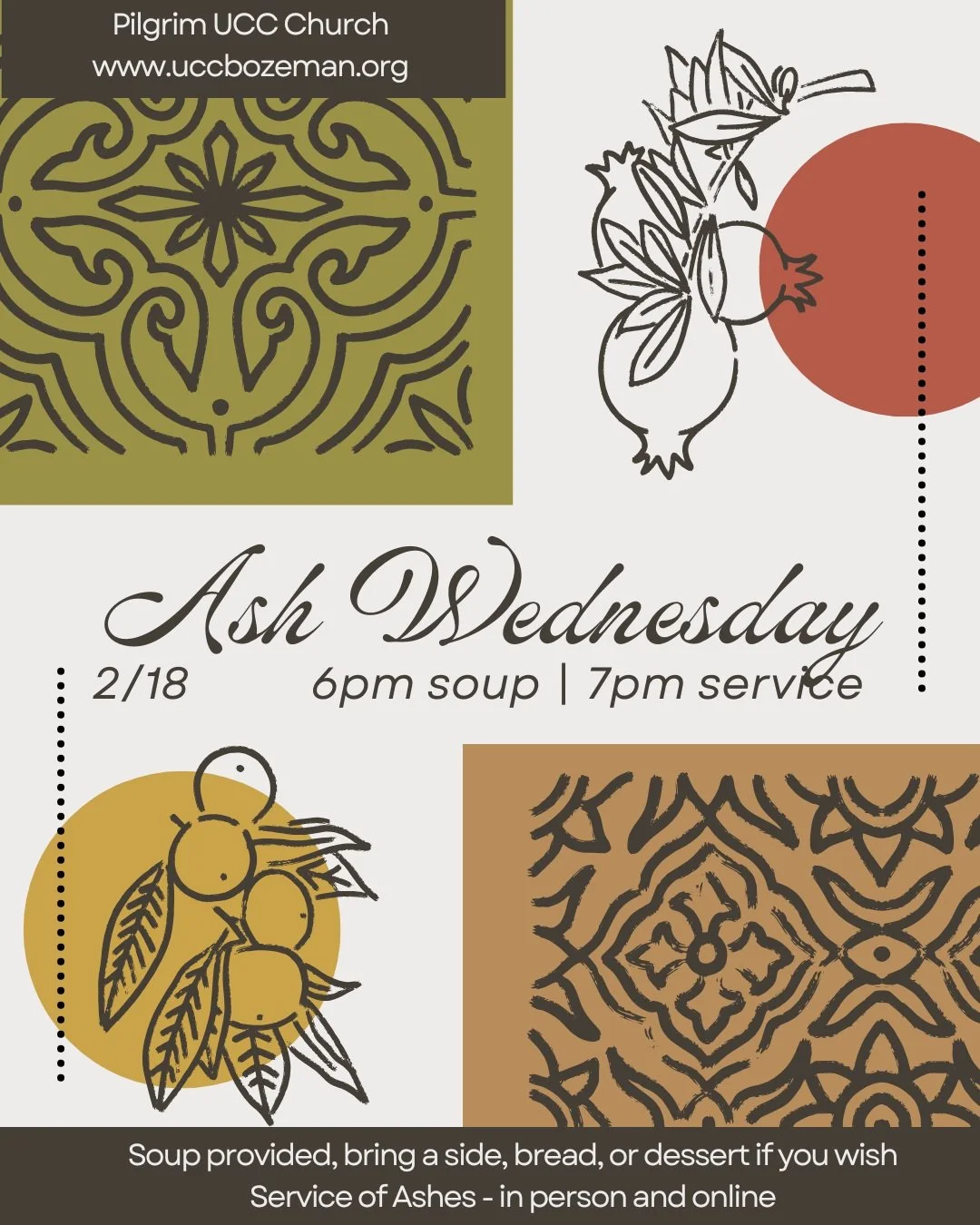 Join us for a simple soup supper at 6pm, followed by an Ash Wednesday service at 7pm with the imposition of ashes, online and in person in our sanctuary at Pilgrim UCC. Soup will be provided for supper. You may bring bread, a side dish or dessert if you wish (no obligation!). Ash Wednesday marks the beginning of a time of introspection and reflection during the Christian church year, leading up to Good Friday and Easter Sunday.