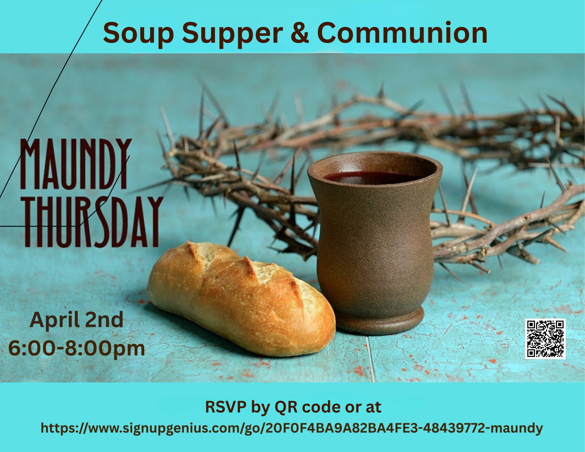 We like to get together to celebrate Maundy Thursday with a warm, tasty bowl of soup and some fellowship with our friends. We follow this relaxing and enjoyable supper up with a special time of communion. Please join us. In order to make sure we provide enough food, we ask that you sign up at the link above or with the QR code on the poster. Everyone is welcome!